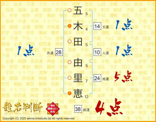 五(5画)木(4画)田(5画) 由(5画)里(7画)恵(12画)
