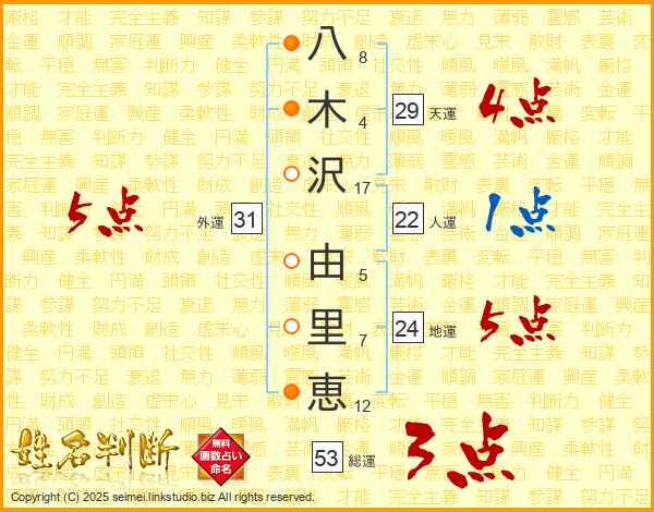 八(8画)木(4画)沢(17画) 由(5画)里(7画)恵(12画)