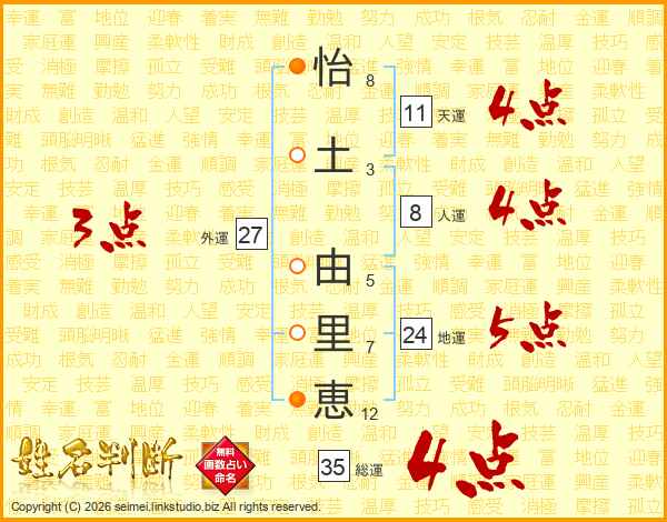 怡(8画)土(3画) 由(5画)里(7画)恵(12画)