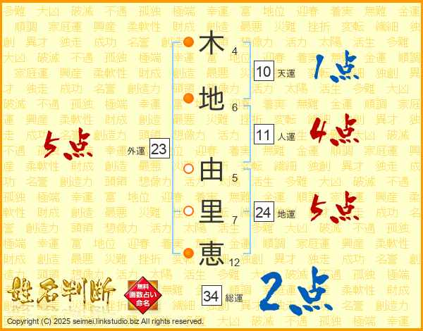 木(4画)地(6画) 由(5画)里(7画)恵(12画)