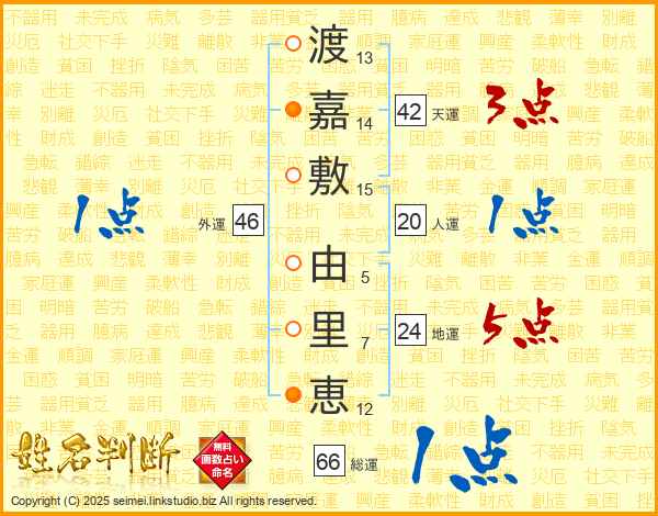 渡(13画)嘉(14画)敷(15画) 由(5画)里(7画)恵(12画)