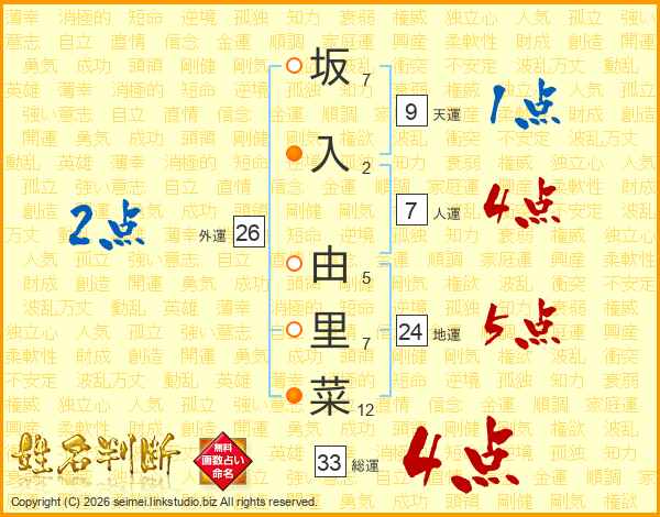 坂(7画)入(2画) 由(5画)里(7画)菜(12画)