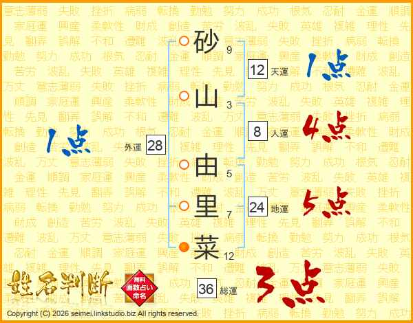 砂(9画)山(3画) 由(5画)里(7画)菜(12画)