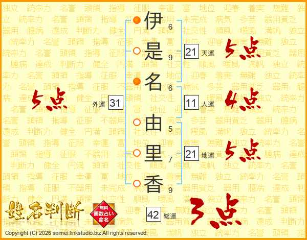 伊(6画)是(9画)名(6画) 由(5画)里(7画)香(9画)