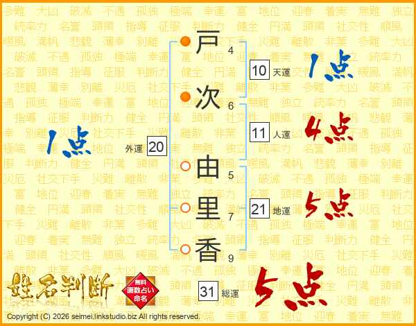 戸(4画)次(6画) 由(5画)里(7画)香(9画)