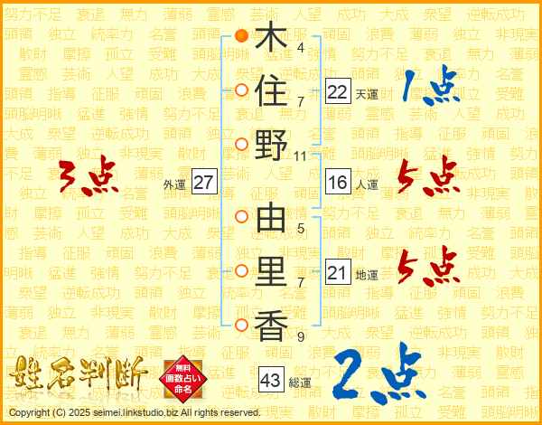木(4画)住(7画)野(11画) 由(5画)里(7画)香(9画)