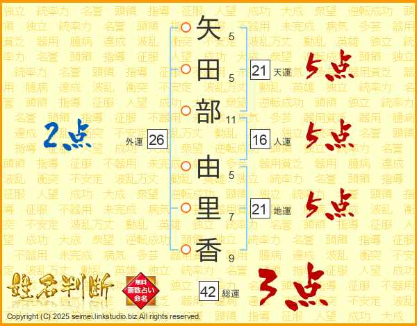 矢(5画)田(5画)部(11画) 由(5画)里(7画)香(9画)