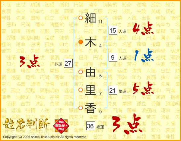 細(11画)木(4画) 由(5画)里(7画)香(9画)