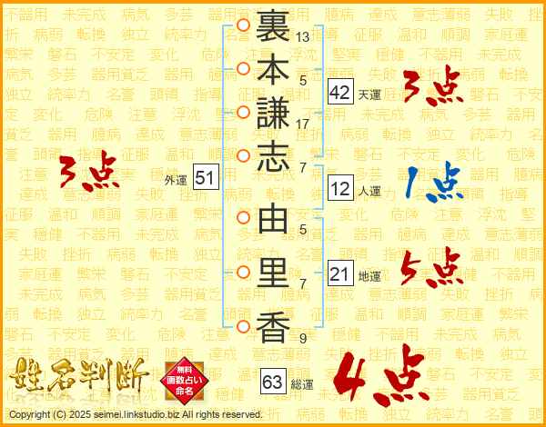 裏(13画)本(5画)謙(17画)志(7画) 由(5画)里(7画)香(9画)
