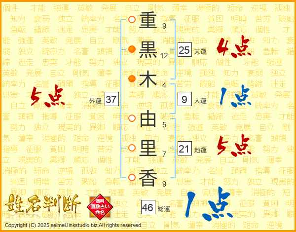 重(9画)黒(12画)木(4画) 由(5画)里(7画)香(9画)