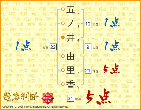 五(5画)ノ(1画)井(4画) 由(5画)里(7画)香(9画)