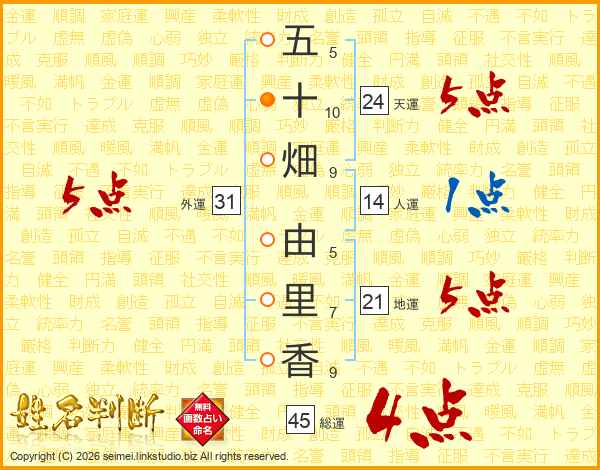 五(5画)十(10画)畑(9画) 由(5画)里(7画)香(9画)