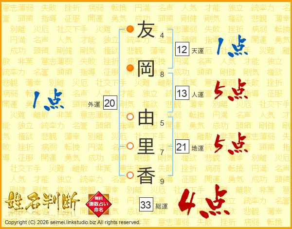 友(4画)岡(8画) 由(5画)里(7画)香(9画)