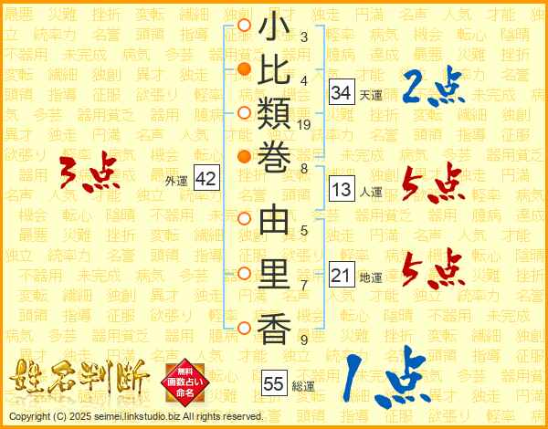 小(3画)比(4画)類(19画)巻(8画) 由(5画)里(7画)香(9画)