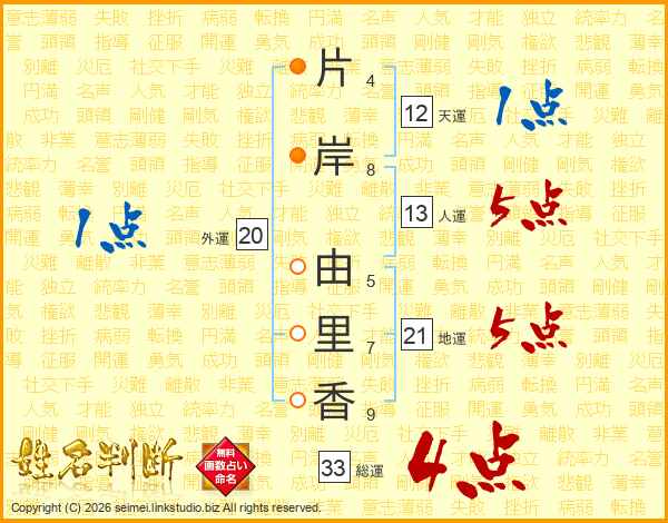 片(4画)岸(8画) 由(5画)里(7画)香(9画)