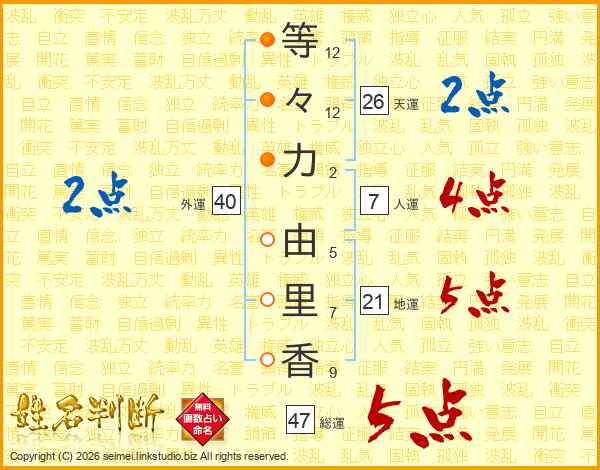 等(12画)々(12画)力(2画) 由(5画)里(7画)香(9画)