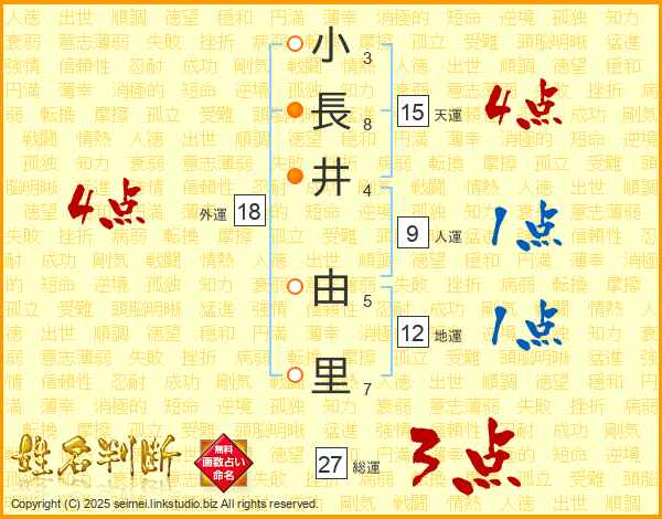 小(3画)長(8画)井(4画) 由(5画)里(7画)