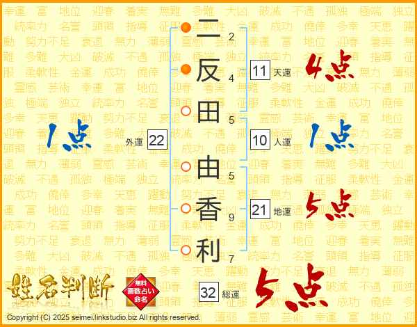 生活面を象徴する運勢です。外部から受ける影響力を表し、結婚運、家庭運や職場、環境への順応性を表します。総運から人運を引いた画数。姓や名が1文字の場合を除く。