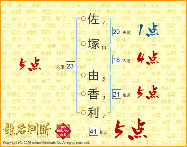 佐(7画)塚(13画) 由(5画)香(9画)利(7画)