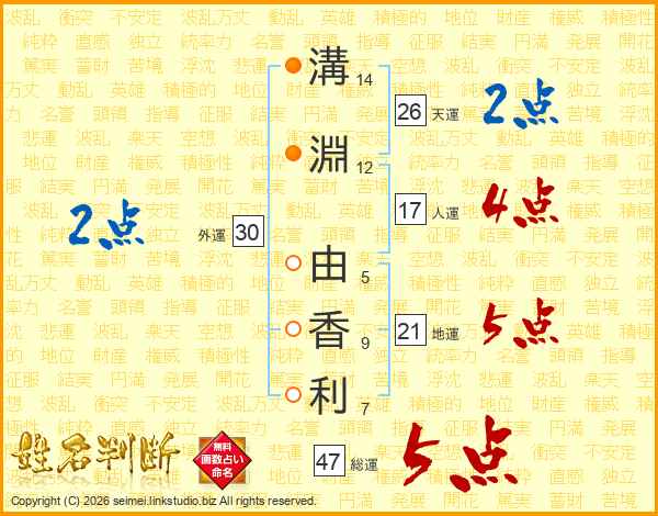 溝(14画)淵(12画) 由(5画)香(9画)利(7画)