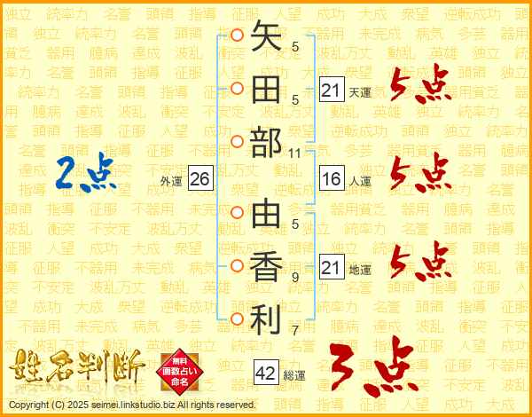 矢田部由香利さんの天運は21画の5点!