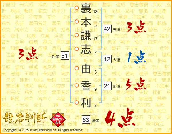 裏(13画)本(5画)謙(17画)志(7画) 由(5画)香(9画)利(7画)