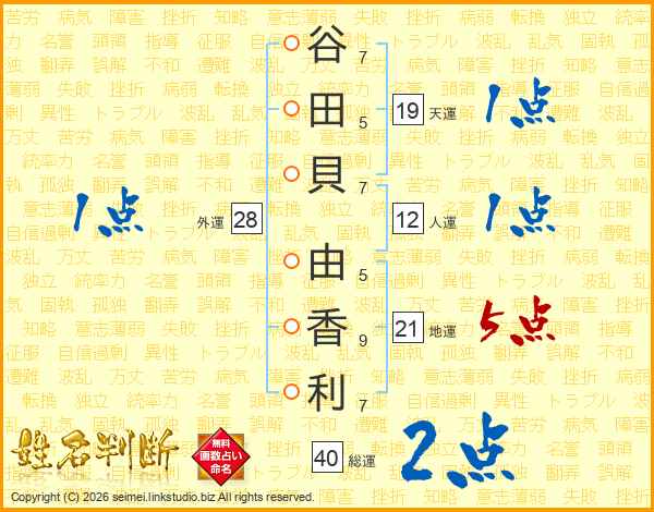 谷(7画)田(5画)貝(7画) 由(5画)香(9画)利(7画)