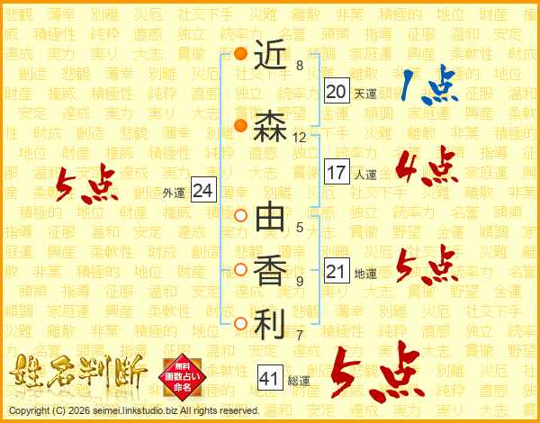 近(8画)森(12画) 由(5画)香(9画)利(7画)