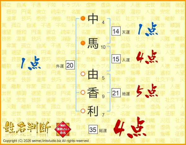 中(4画)馬(10画) 由(5画)香(9画)利(7画)
