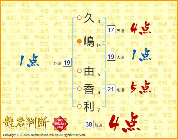 久(3画)嶋(14画) 由(5画)香(9画)利(7画)