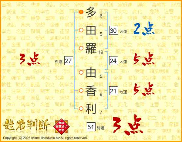 多(6画)田(5画)羅(19画) 由(5画)香(9画)利(7画)
