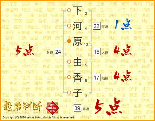 下河原由香子さんの総運は39画の5点!