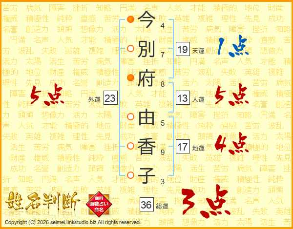今(4画)別(7画)府(8画) 由(5画)香(9画)子(3画)