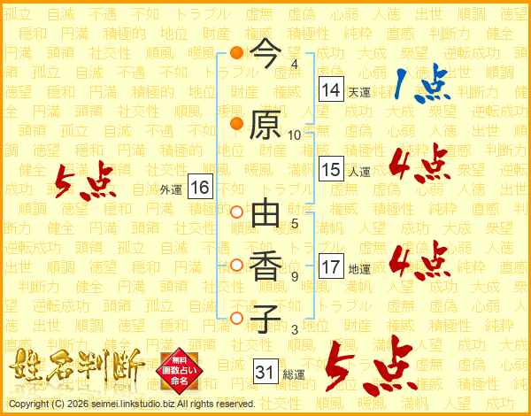 今(4画)原(10画) 由(5画)香(9画)子(3画)