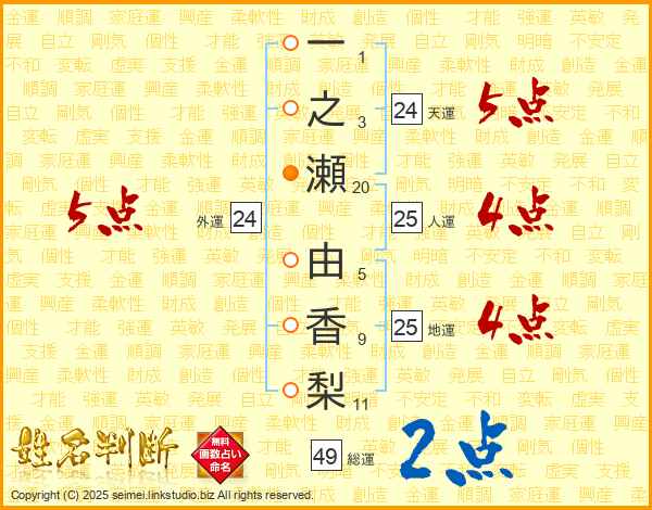 一(1画)之(3画)瀬(20画) 由(5画)香(9画)梨(11画)