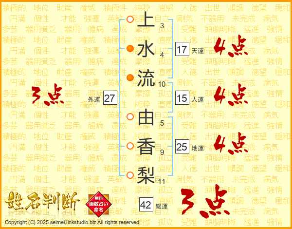 上(3画)水(4画)流(10画) 由(5画)香(9画)梨(11画)