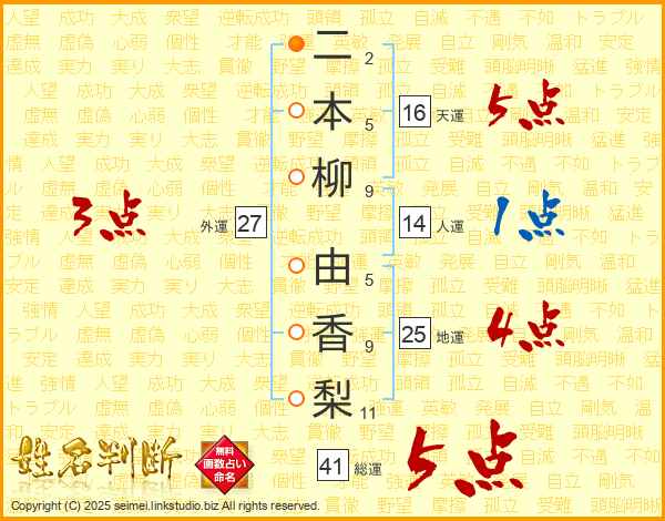 二(2画)本(5画)柳(9画) 由(5画)香(9画)梨(11画)