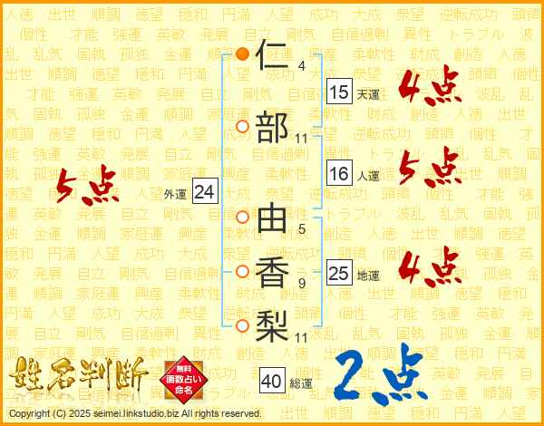 仁(4画)部(11画) 由(5画)香(9画)梨(11画)
