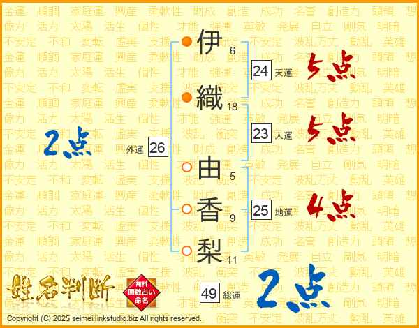 伊(6画)織(18画) 由(5画)香(9画)梨(11画)