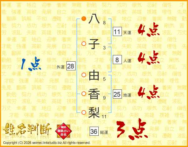 八(8画)子(3画) 由(5画)香(9画)梨(11画)