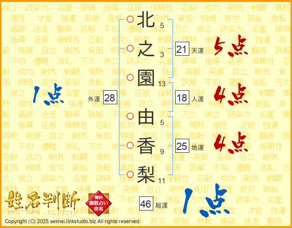 北(5画)之(3画)園(13画) 由(5画)香(9画)梨(11画)