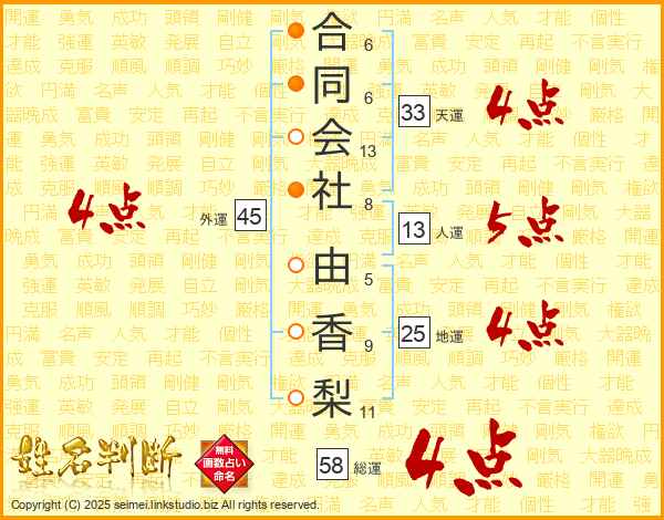 合(6画)同(6画)会(13画)社(8画) 由(5画)香(9画)梨(11画)