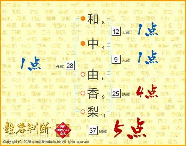 和(8画)中(4画) 由(5画)香(9画)梨(11画)