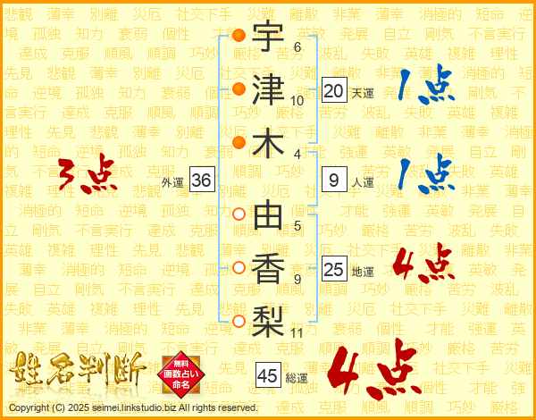 宇(6画)津(10画)木(4画) 由(5画)香(9画)梨(11画)