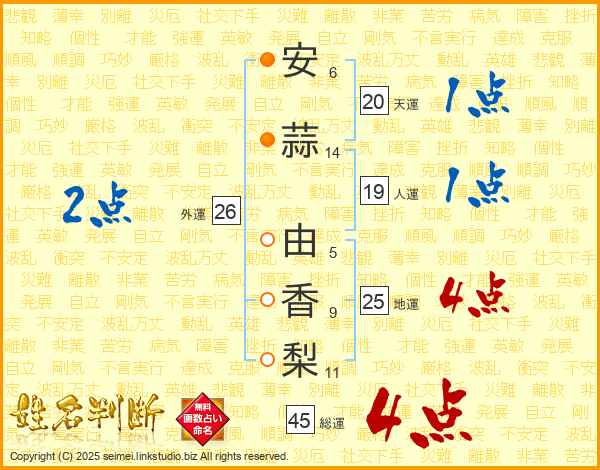 安(6画)蒜(14画) 由(5画)香(9画)梨(11画)