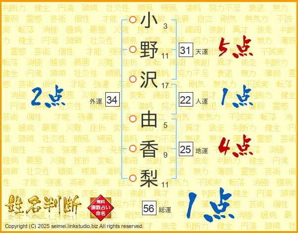 小(3画)野(11画)沢(17画) 由(5画)香(9画)梨(11画)