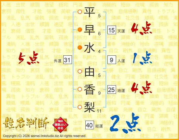平(5画)早(6画)水(4画) 由(5画)香(9画)梨(11画)