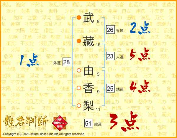 武(8画)藏(18画) 由(5画)香(9画)梨(11画)