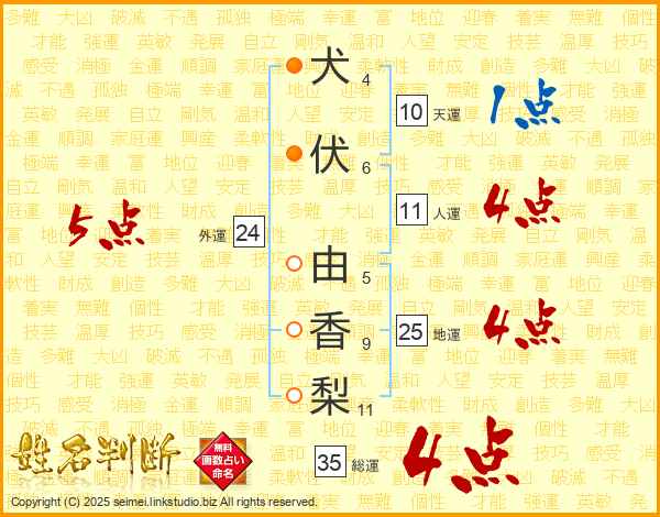 犬(4画)伏(6画) 由(5画)香(9画)梨(11画)
