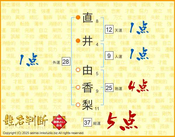 直(8画)井(4画) 由(5画)香(9画)梨(11画)